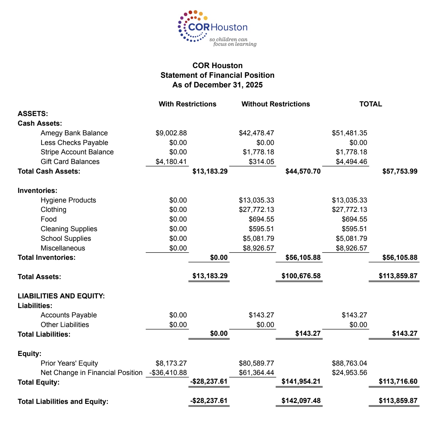 As a not-for-profit organization, COR Houston is committed to financial transparency and prudent financial management. Our fiscal year runs from January 1 to December 31. Our organization is sustained by cash and in-kind donations, and we are very grateful to all our donors.